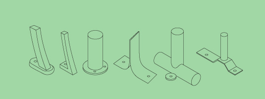 In-ground mounted furniture resembles surface mounted furniture, but includes "J-Rods" to be inserted through the surface mount holes on a piece of furniture. The bottom of the J-Rod is then embedded in a hole filled with concrete. When the concrete cures, the shape of the J-Rod secures the furniture. Benches that have tubular legs and are in-ground mounted do not use J-Rods. Instead, the understructure ends in approximately 18" of extra pipe (see far right) with a piece of flatbar welded to the bottom. A deep hole is then dug and filled with concrete. The bench is then set in the concrete to cure. In-ground mounted furniture is placed on a grass or soil surface. |